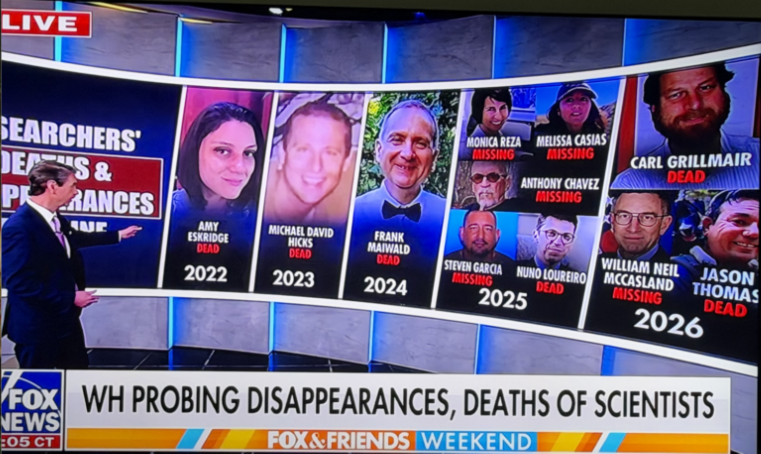 相关案件的地理范围远不止加州。其中最受关注的失踪者之一是美国空军退役少将威廉·“尼尔”·麦卡斯兰(William "Neil" McCasland)。他于2026年2月在新墨西哥州的家中失踪。当时他留下了手机和眼镜,但带走了一把左轮手枪。麦卡斯兰此前曾领导空军研究实验室(Air Force Research Laboratory),并与不明空中现象(Unidentified Aerial Phenomena,UAP)研究有关。其他被纳入调查的案件包括:亚拉巴马州科学家艾米·埃斯克里奇(Amy Eskridge),她在2022年去世前曾声称因“奇异物理学”研究而受到骚扰;麻省理工学院等离子体科学与聚变中心主任努诺·洛雷罗(Nuno Loureiro),他于2025年底在家中遭谋杀。